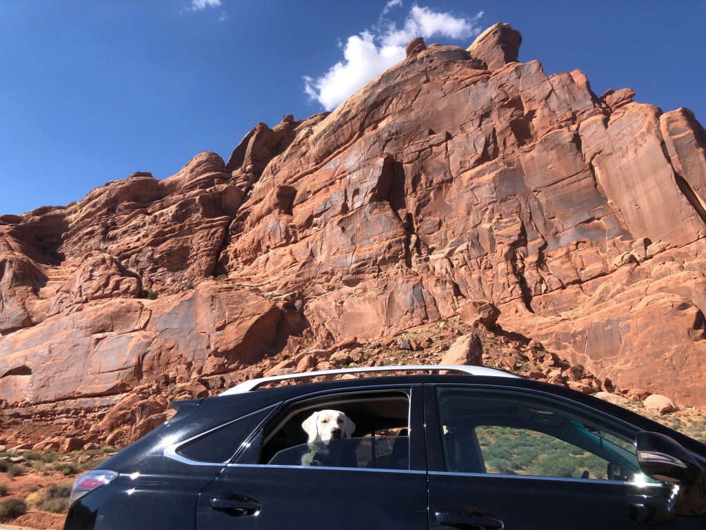 Despite our limitations, this was an amazing place filled with one incredible, immense, sandstone sculpture after another. Clearly, Jim and I need to work on our vocabulary, because we just kept repeating “wow!”, and “this is crazy!” As the day waned, we pulled over at a lonely overlook, set up two little beach chairs (and a blanket for Pasha), cracked open some White Claws (classy!) to accompany our picnic dinner, and watched the sunset. The changing light and shadows on the rock formations and arches were certainly a sight to see.