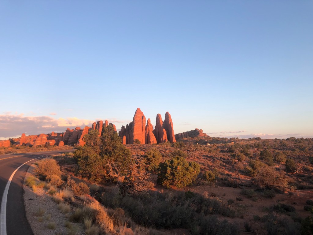 A five hour drive brought us to our hotel in Moab where we checked in and headed right back out to Arches National Park with a picnic dinner and the dog. Since we were limited to just driving (dogs are only allowed out of the car in the parking lots), we figured we’d hit every scenic pull-over along the 18 mile drive. We took turns at the several parking lots with one of us hiking a little ways up a trail, while the other walked the dog and took in the views from near the car.