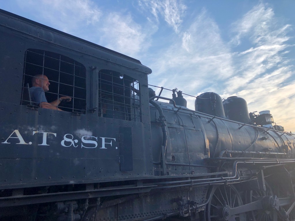 This was one of our longest drives at around 6 hours, but the diversity of the scenery made it fly by… oh wait, it was flat-flat-flat and about 200 miles without a town. Even with the pretty, big sky, we thought it felt endless, and we could only imagine how it must have felt to the early settlers who rolled along in wagon trains at 10 miles per day. Respect! When we hit Dodge City our spirits were high – I love the old west! – and as we crested a rare hill, there was a really cool life-size metal silhouette. sculpture of cowboys on horseback overlooking the town. Yeehaw! But, I’m sad to say, that was the highlight of this little town. Like lots of old west boomtowns, this one’s heyday seems to have passed. The charming old part of town was tired and run down although you could see what it once was. Due to the dog, we skipped the small, well-kept museum that looked like it might have been interesting. The quasi-highlight was an actual, giant steel steam engine that you could climb up in. It was massive, and had travelled over 1 million miles in the late 1800s transporting cattle driven up from Texas (nearly 5 million in a 10 year period!) to the markets back east.